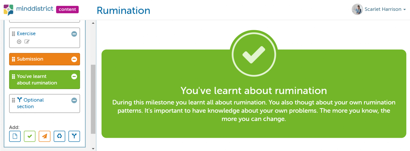 Ein Meilenstein ist ein extrinsischer Motivator, um die Motivation der Endbenutzer zu steigern. Es ist ein grüner Block mit einem Häkchen. Als Redakteur können Sie überall Meilensteine hinzufügen. Wir empfehlen Ihnen jedoch, sorgfältig über deren Platzierung nachzudenken (siehe Richtlinien unten).